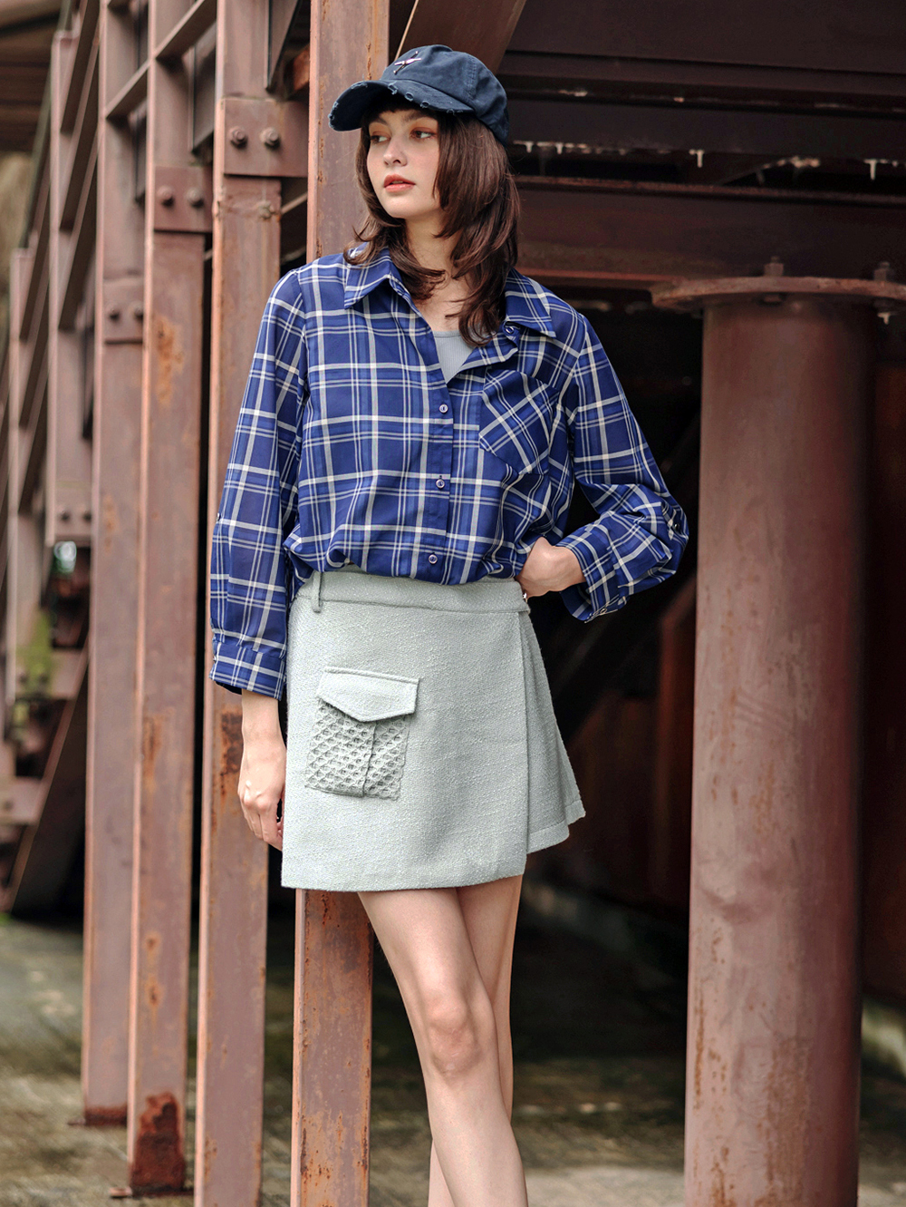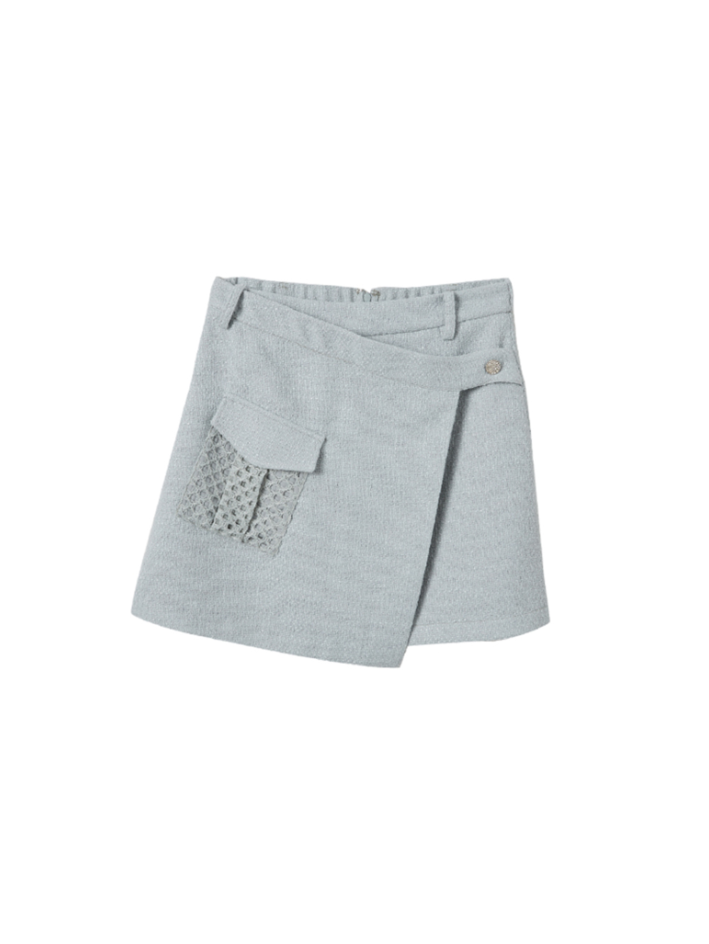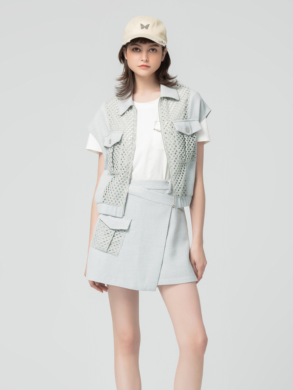 材質屬於較薄軟的小香風毛呢布料,色系清爽柔和,正面不對稱的剪裁帶有休閒感,能中和布料本身的正式感,內建安全褲。可與同系列背心成套穿著。