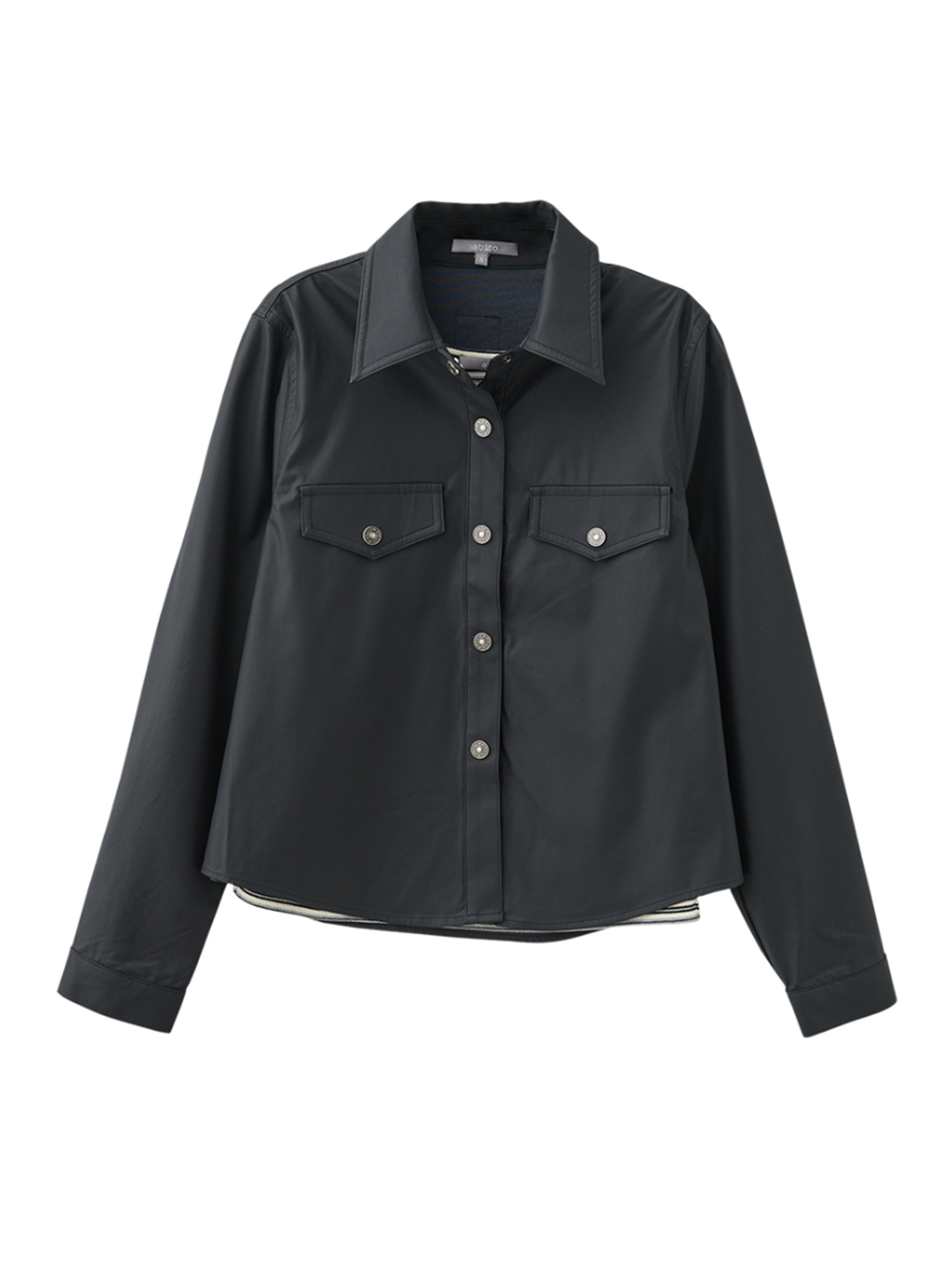 *短版修身剪裁 *內搭條紋背心,彈性柔軟親膚 *特殊皮革面料 *秋季個性休閒穿搭
