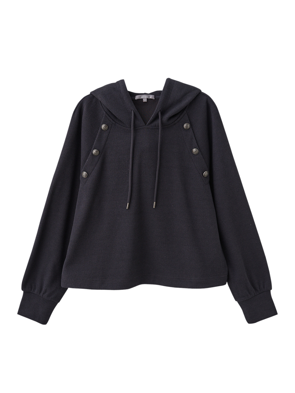 *落間拉克蘭袖版型 *袖肩金屬裝飾釦細節 *下擺可自由調節設計 *布料柔軟親膚