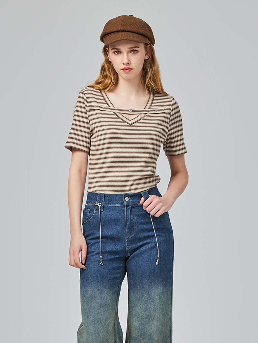 *V字領口設計 *領口上愛心釦裝飾 *舒適彈性布料 *版型修身