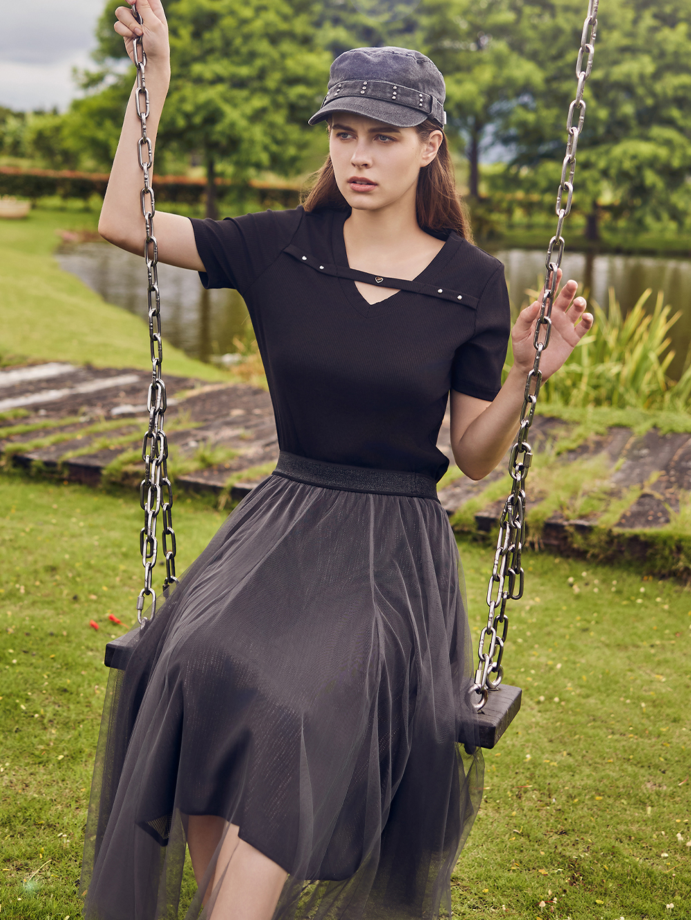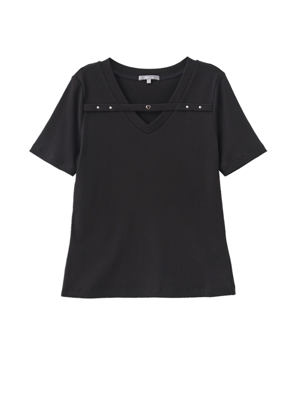 *V字領口設計 *領口上愛心釦裝飾 *舒適彈性布料 *版型修身