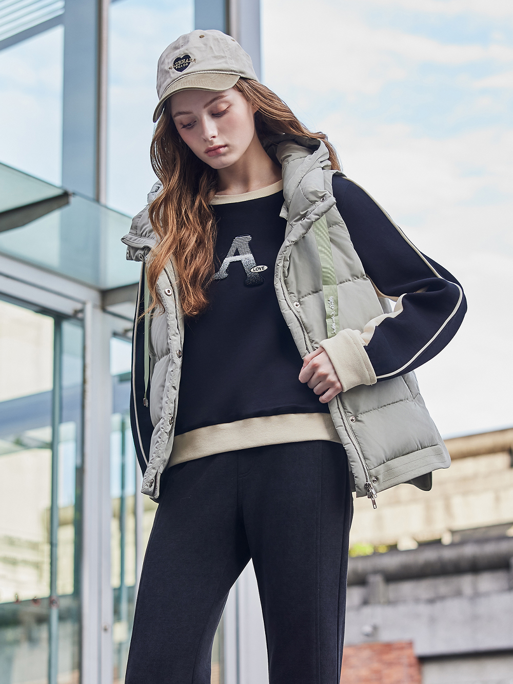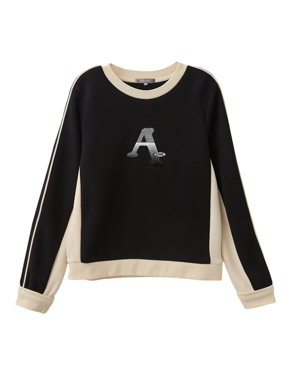 *圓領羅紋加強領口彈性與耐用 *特殊工藝,刺繡亮片字母 *跳色拼接造型 *柔軟面料