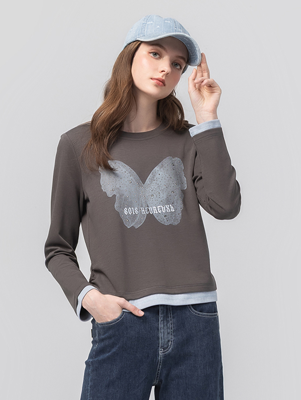 *舒適圓領版型 *下襬、袖口雙層設計 *精細蝴蝶貼鑽造型 *柔軟親膚面料