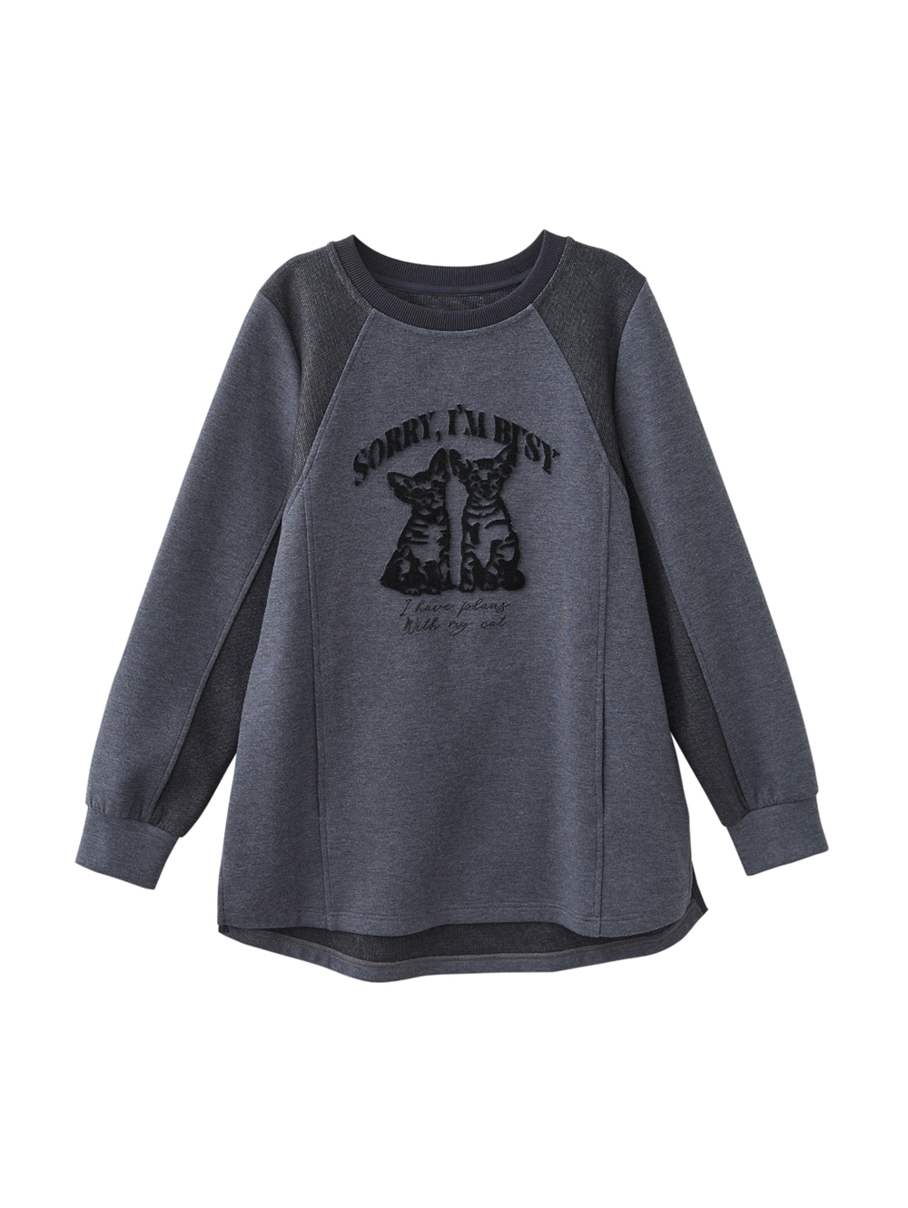 以立體絨布貓咪刺繡呈現圖文樣貌, 可愛又有態度; 內磨毛面料柔軟保暖, 是寒冷季節最實穿的長版上衣。