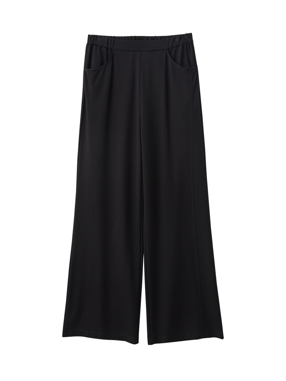 彈性機能與垂墜度都優選的羅馬布面料, 整圈鬆緊腰頭舒適好套穿, 可與同系列條文布拼接彈性上衣做成套穿搭。