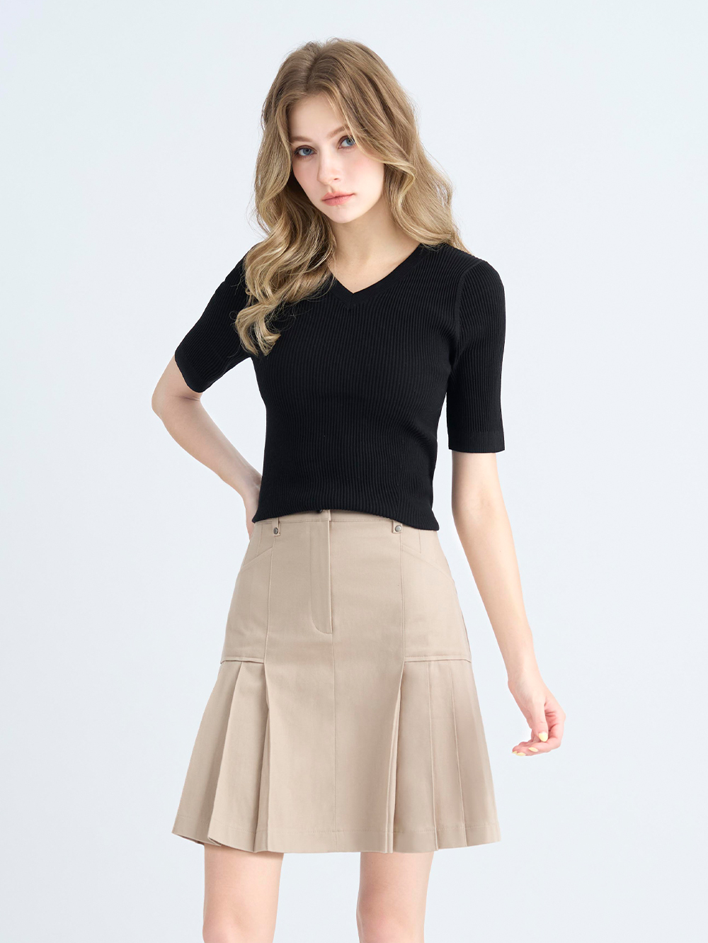 擺脫制服感, 利用雙側壓摺讓短裙轉變為大人味的文藝風格, 穿搭場域更多元。