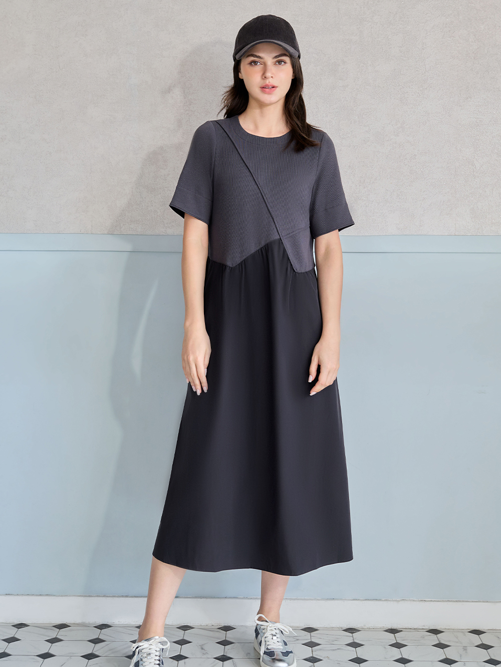 彈性面料活動機能舒適, 衣身不對襯切割讓視覺更顯瘦, 輕盈不易皺裙擺拼接, 層次感豐富一件套穿完成一日穿搭。