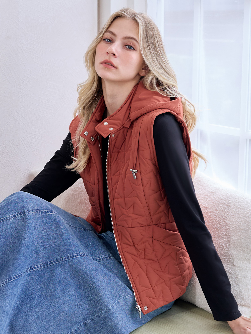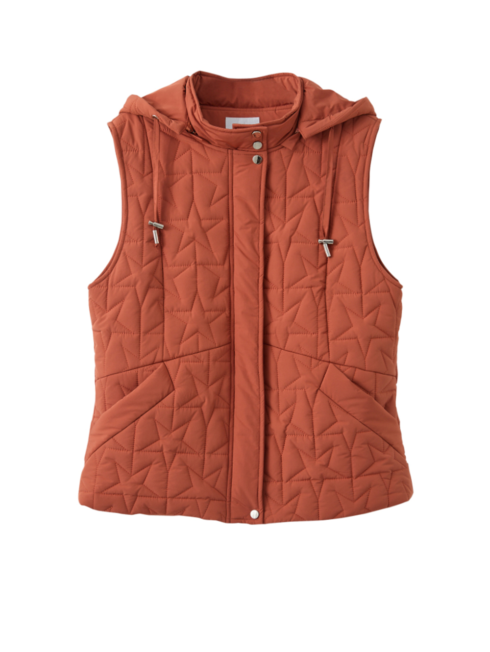 活動式帽子, 微腰身蓋髖骨版型, 俐落修身, 星星绗縫活潑減齡, 同時也降低鋪棉背心的蓬鬆感更顯瘦。