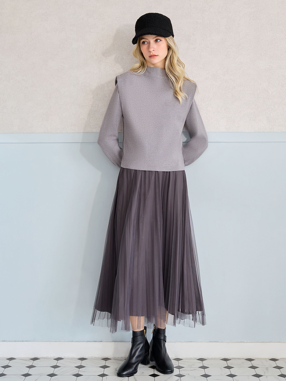 針織衣身拼接網紗裙擺, 搭配活動針織背心, 展現秋冬最具層次感的優雅輪廓。