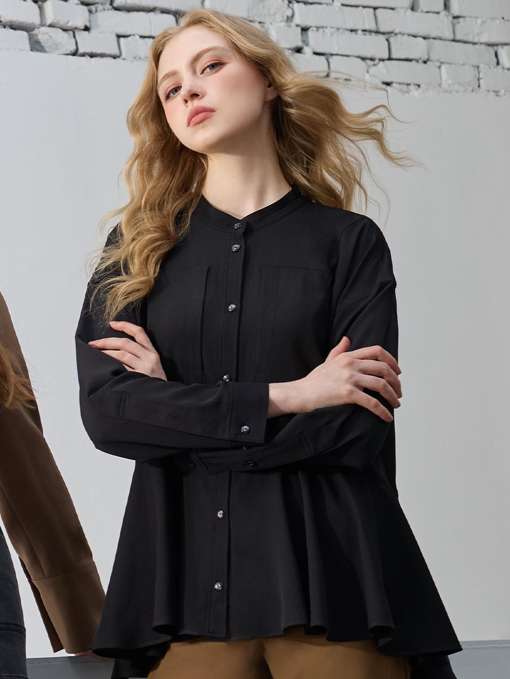 簡約中展現優雅細節, 俐落簡約上身搭配飄逸荷葉層次下擺, 打造優雅隨興又具造型感穿搭。