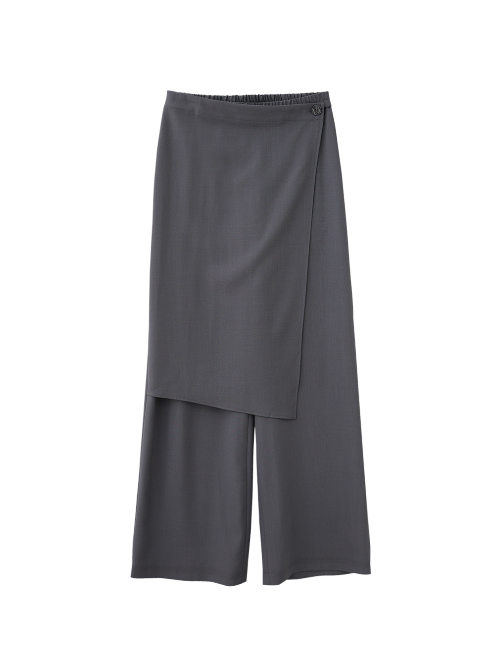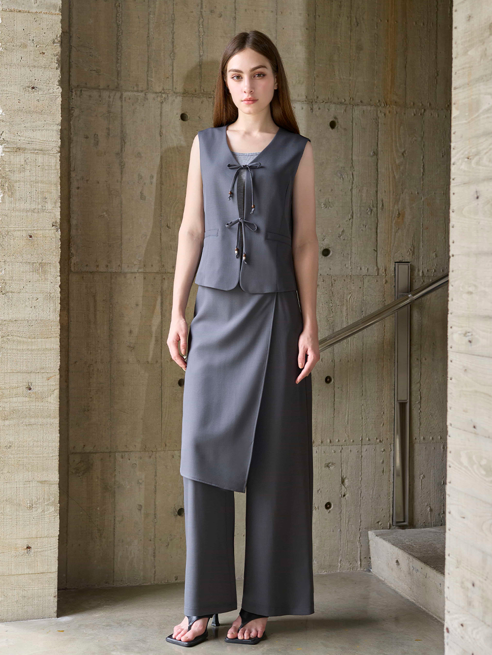 過膝長度的不對襯裙片, 不挑身高的顯瘦特色單品, 可與同面料V領綁帶西裝背心搭配。