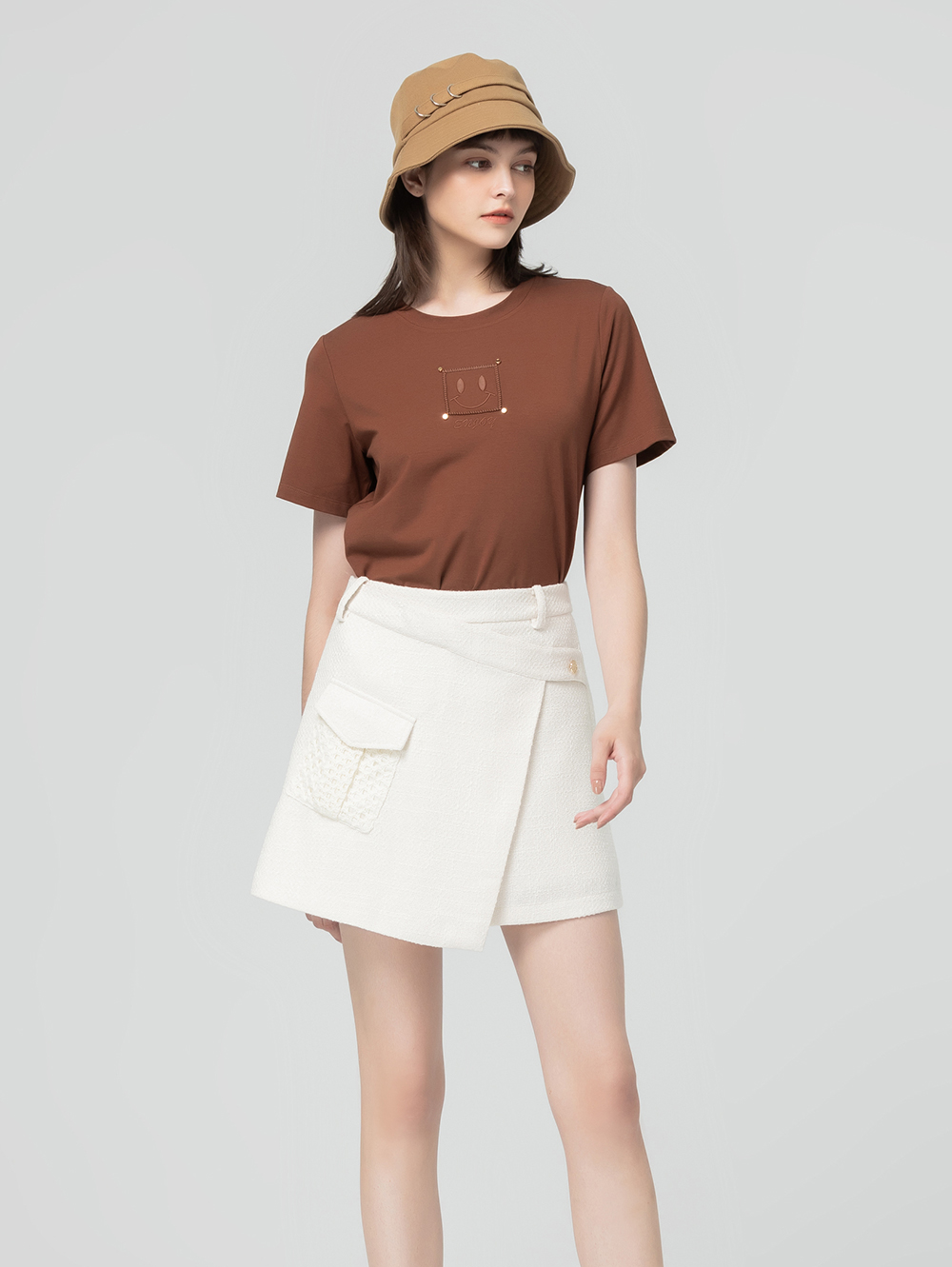 材質屬於較薄軟的小香風毛呢布料,色系清爽柔和,正面不對稱的剪裁帶有休閒感,能中和布料本身的正式感,內建安全褲。可與同系列背心成套穿著。