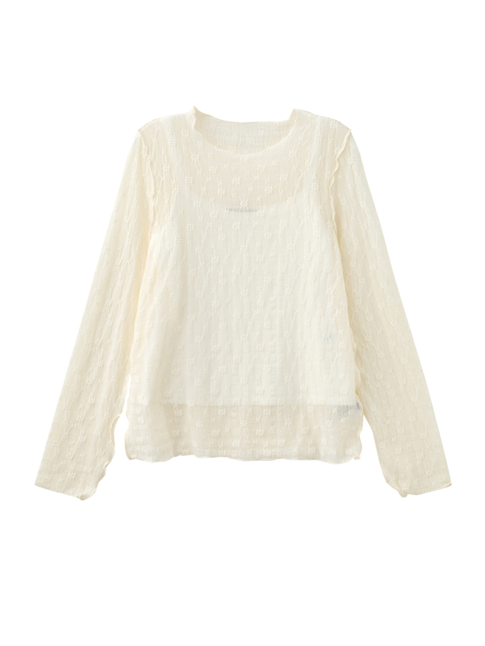 *透膚蕾絲面料 *布料柔軟親膚 *內附肩帶小內搭 *圓領密考呈現波浪造型