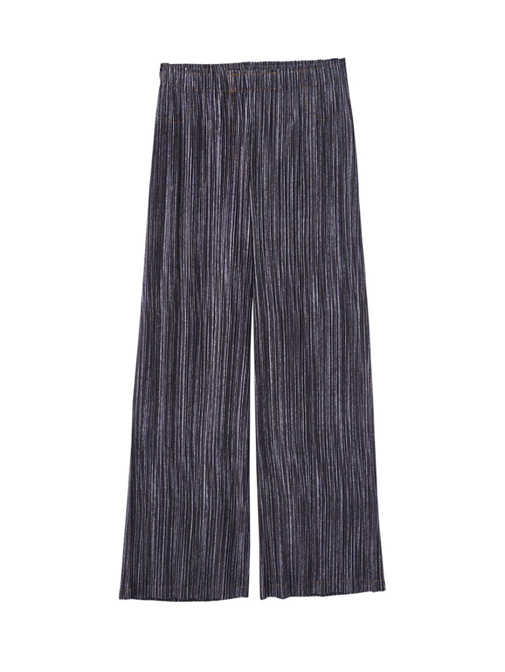 *褶皺壓紋布料修飾身形 *舒適彈性鬆緊腰頭 *寬鬆寬褲剪裁版型 *布料黑灰自然暈邊印花設計