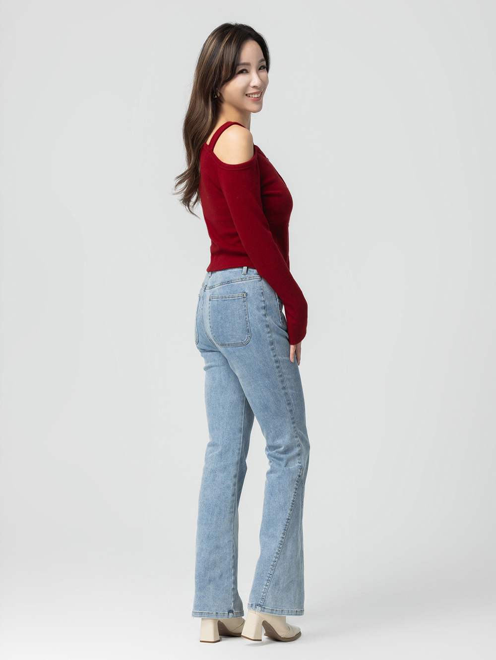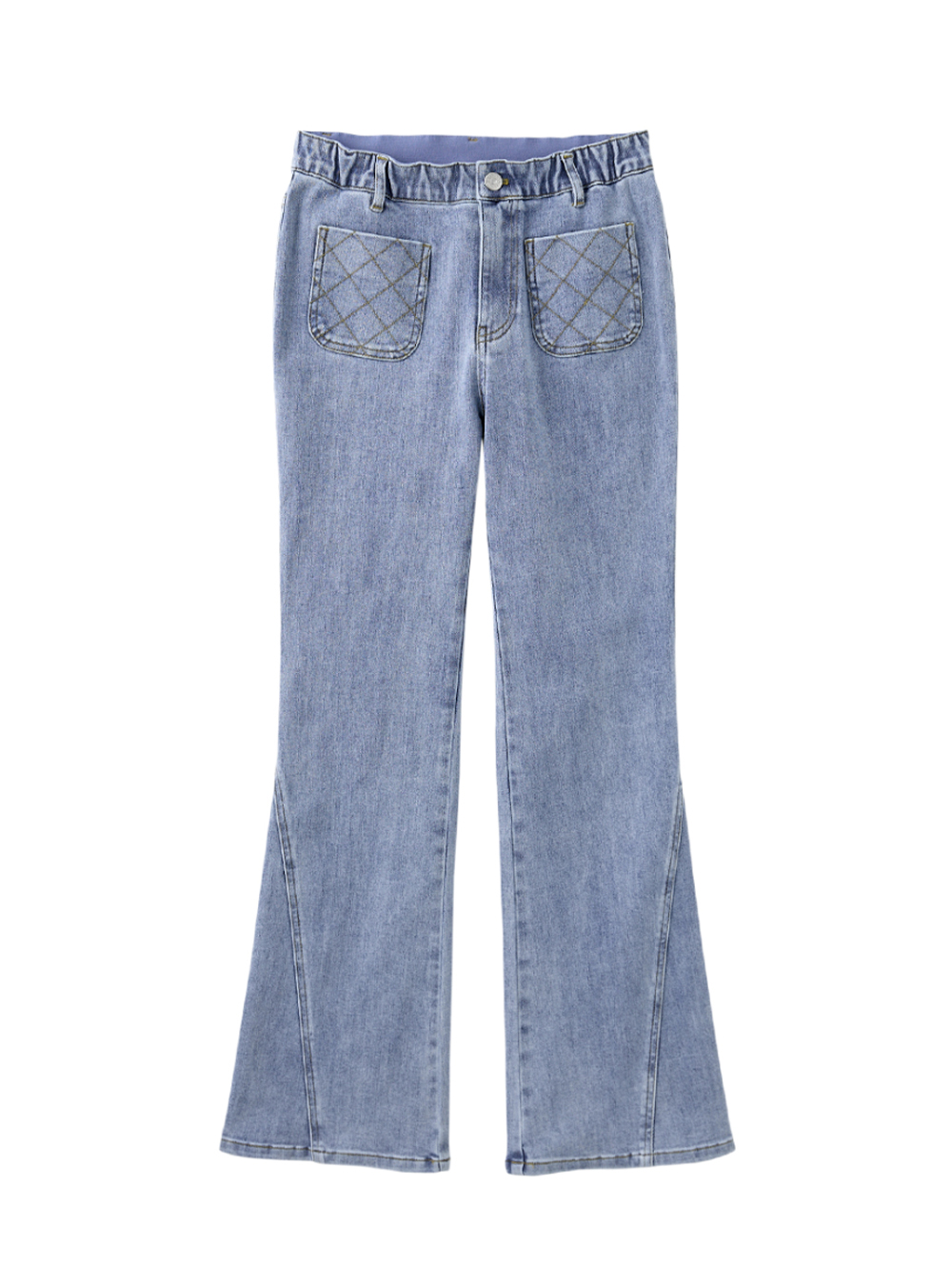 *口袋菱格車線細節 *微喇叭版型拉長身材比例 *褲管斜邊剪裁版型修飾線條 *棉質彈性面料