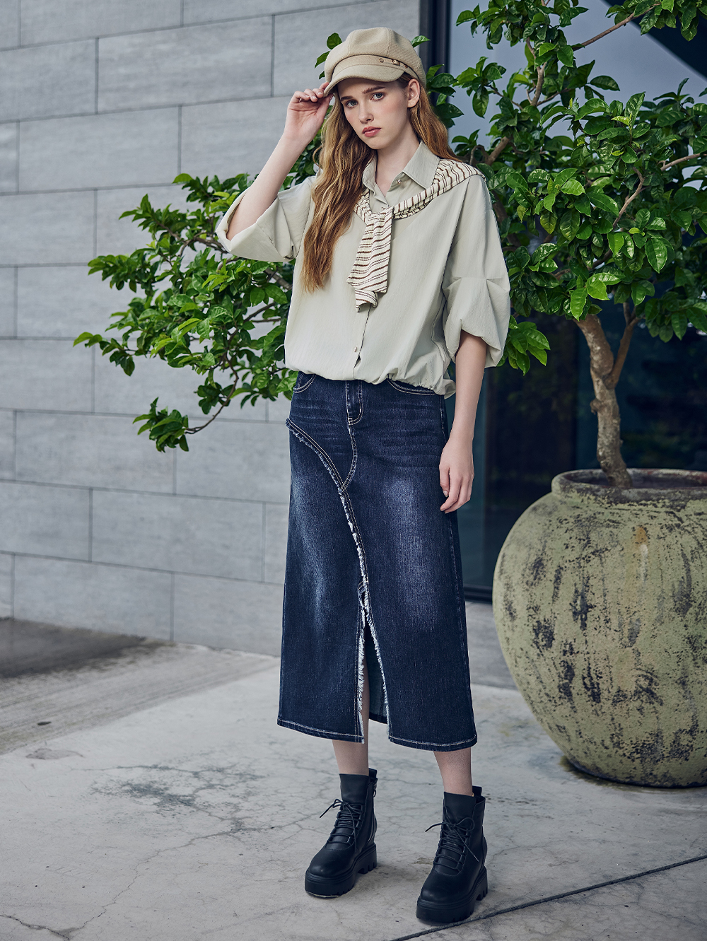 *斜邊開口造型修飾臀型 *舒適棉質面料 *裙擺休閒不收邊設計 *日常百搭款