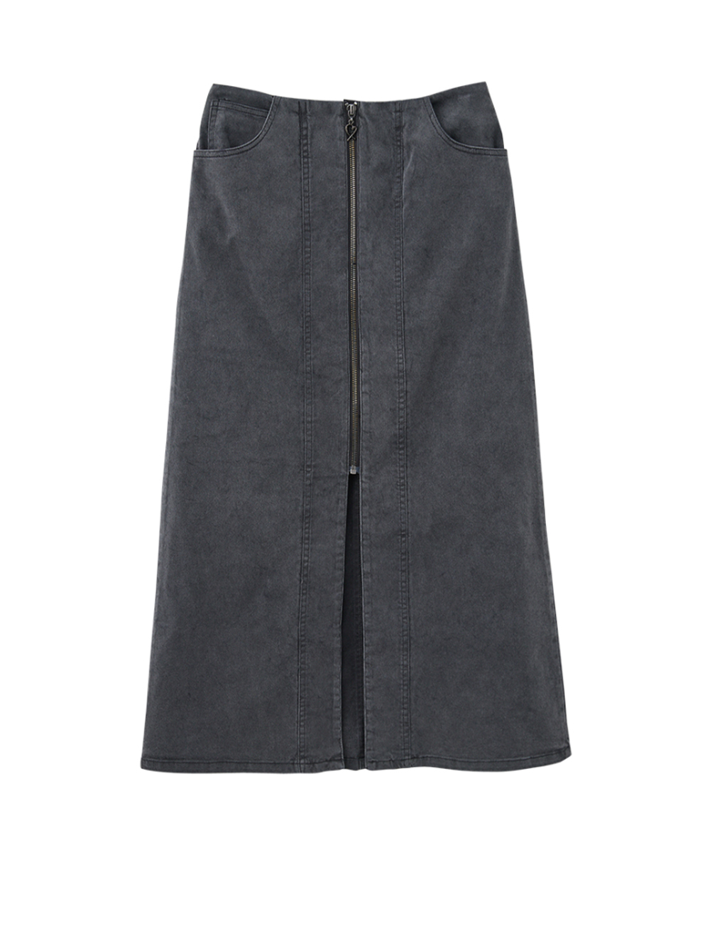 *無腰頭設計,線條乾淨利落 *前開金屬拉鍊剪裁 *下擺前開口版型,行動不拘束 *棉質彈性牛仔面料