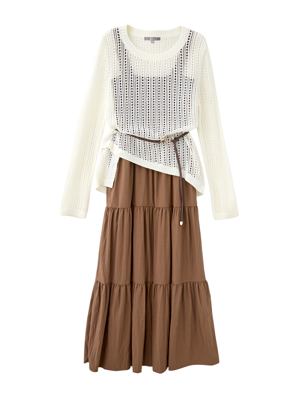 *下擺不對稱開衩造型 *寬鬆簍空針織設計 *內搭連身蛋糕裙 *肩帶釦子可自由調節長度