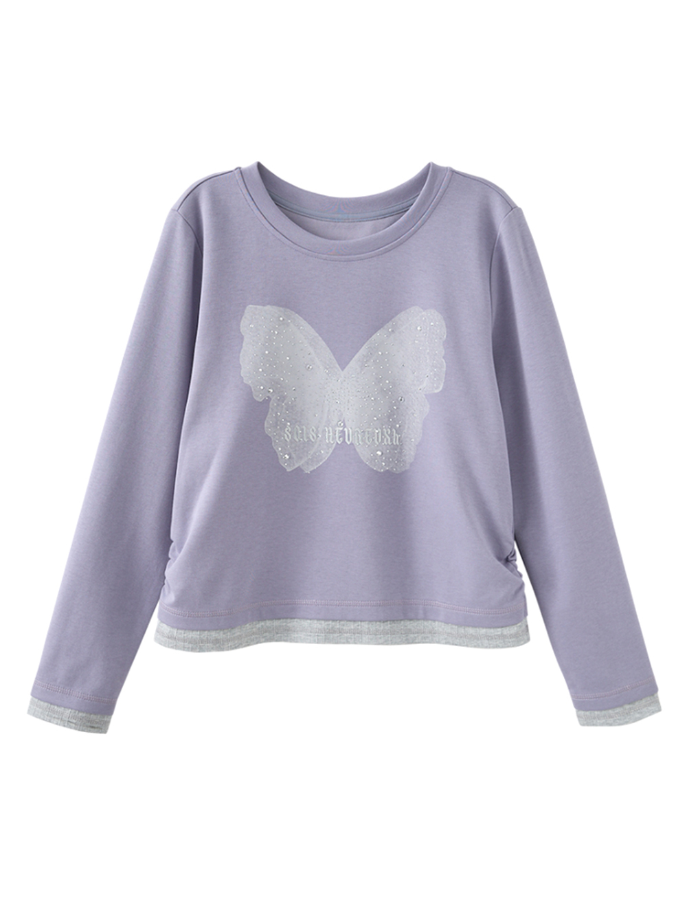 *舒適圓領版型 *下襬、袖口雙層設計 *精細蝴蝶貼鑽造型 *柔軟親膚面料
