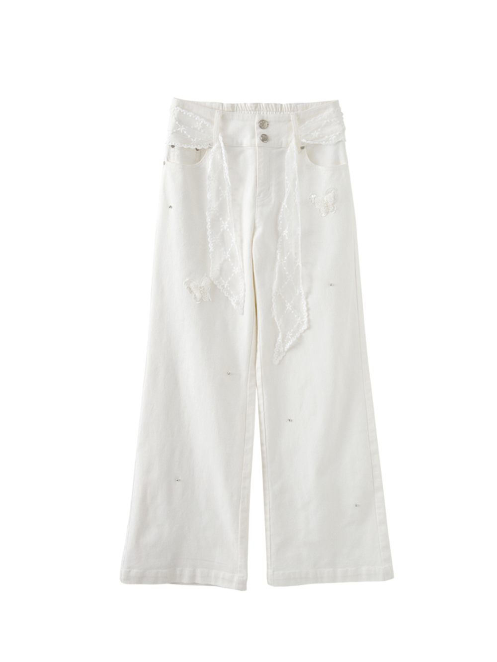 *精緻繡花蝴蝶亮片 *高腰雙釦腰頭 *寬鬆舒適版型拉長腿部線條 *棉質柔軟面料