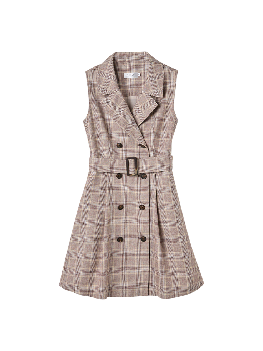 雙色的格紋布料活潑又不過度花俏,下擺的裙型修飾又俏麗,雙排扣和大翻領的設計讓洋裝看起來更有層次感。