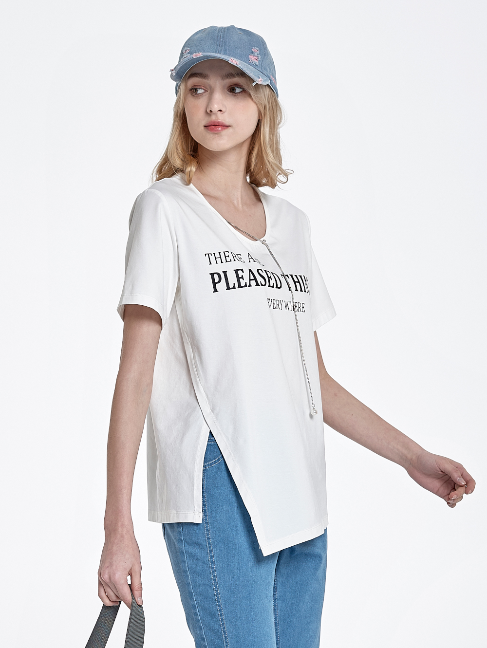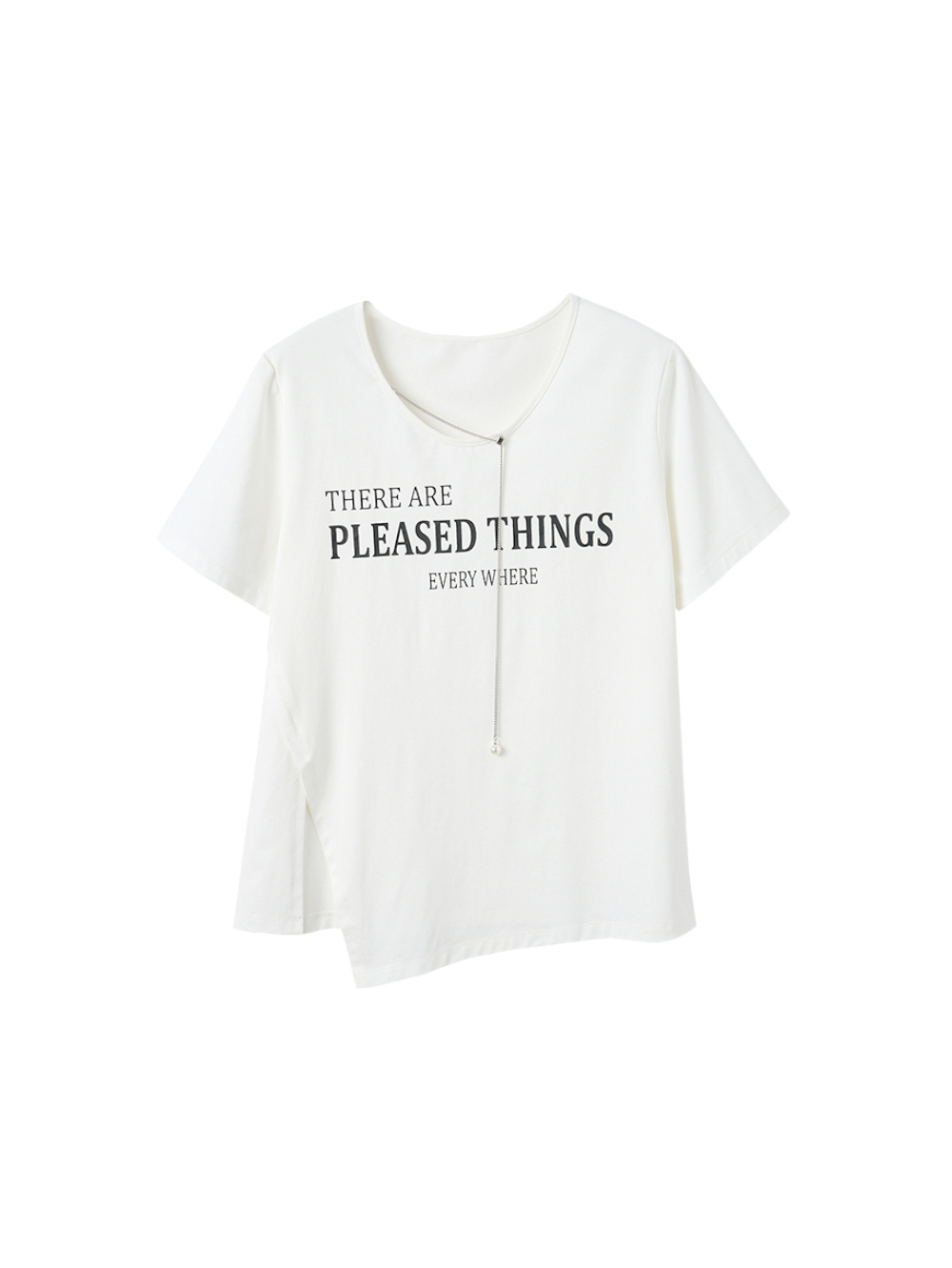 特殊的金屬鍊設計幫你解決搭配飾品的煩惱,質感的印字工藝,以及下襬的開衩細節,簡單的T-shirt卻能穿出質感時尚。