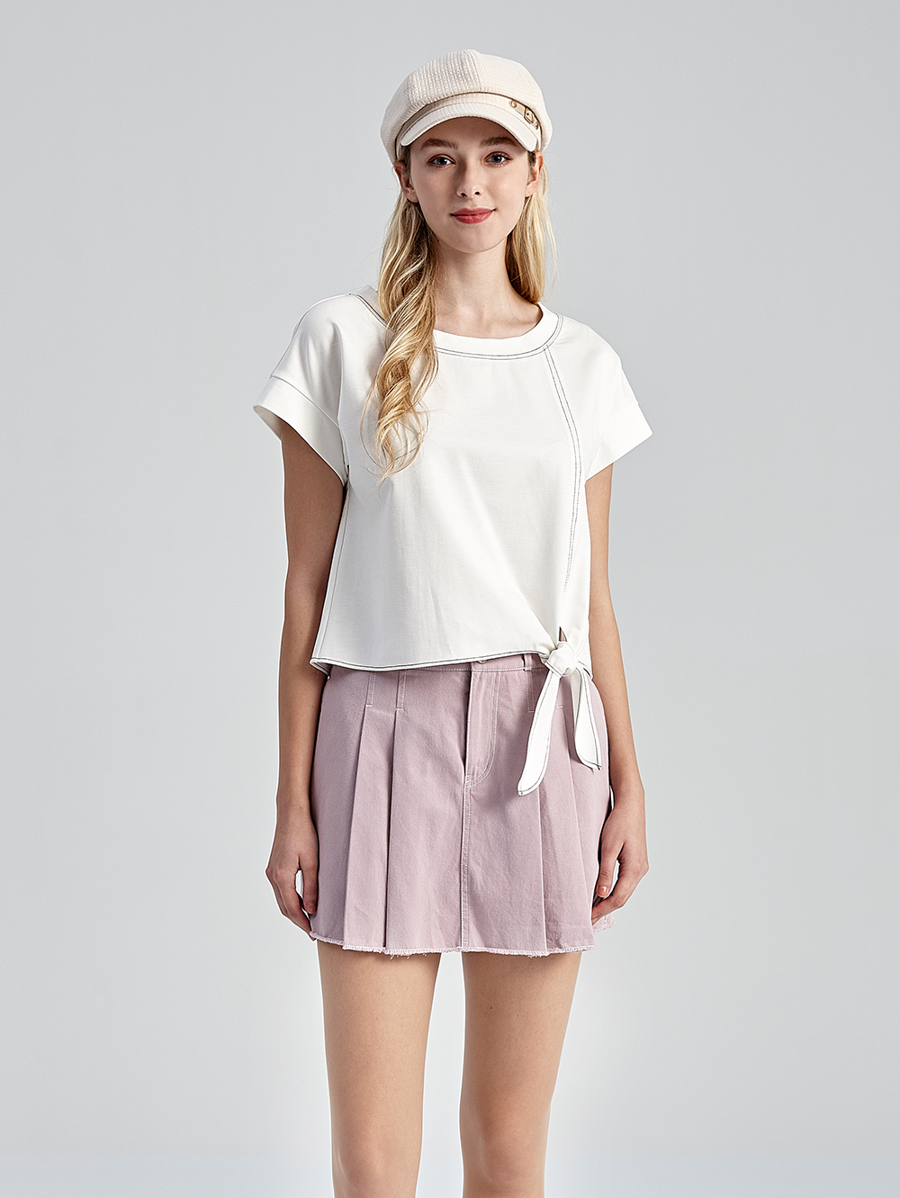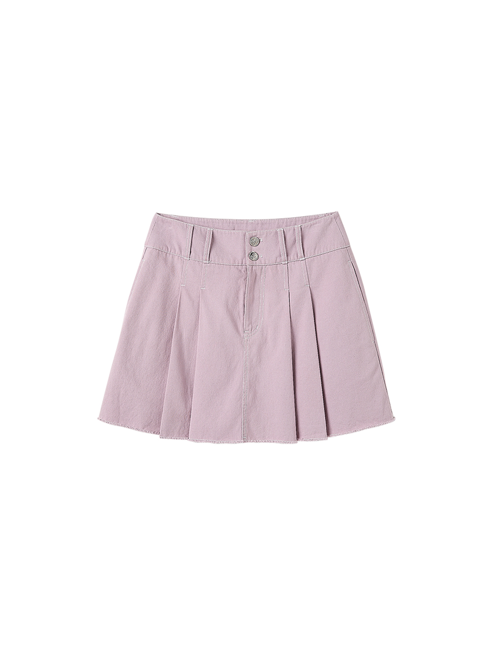 俐落的丹寧百褶短裙,配上可愛的刺繡圖案,瞬間讓造型都變得活潑起來,搭上套裝的丹寧短版外套,更增添整體的設計感。