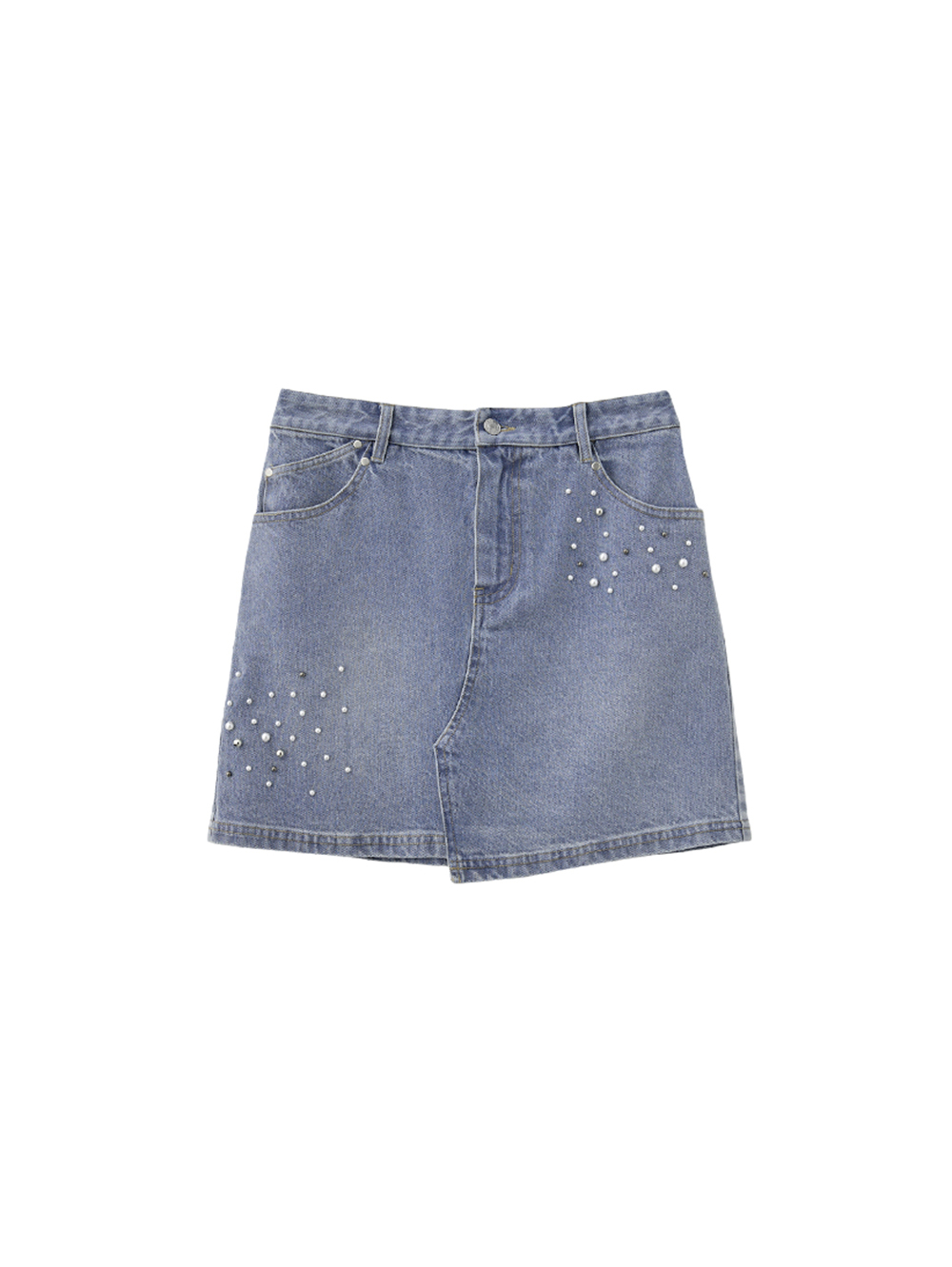 JOAN珍珠裝飾不對稱牛仔短裙-藍 JOAN珍珠裝飾不對稱牛仔短裙-藍 JOAN珍珠裝飾不對稱牛仔短裙-藍