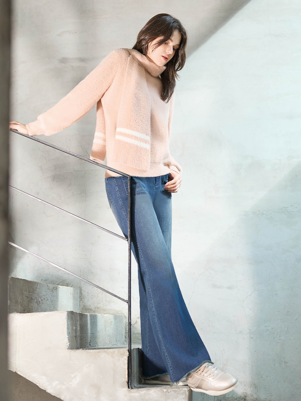 一穿就能拉長腿部比例的微喇叭褲, 內裡輕磨毛處理, 觸感柔和溫暖不厚重, 秋冬換季也能舒適穿搭。