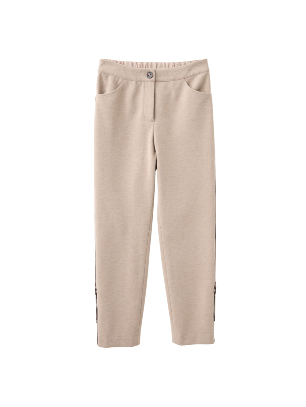 柔軟質感與俐落版型的完美結合。微面磨毛手感, 細膩溫潤, 帶來舒適的穿著體驗; 側邊拼接異材質裝飾織帶增添層次感與時尚度。