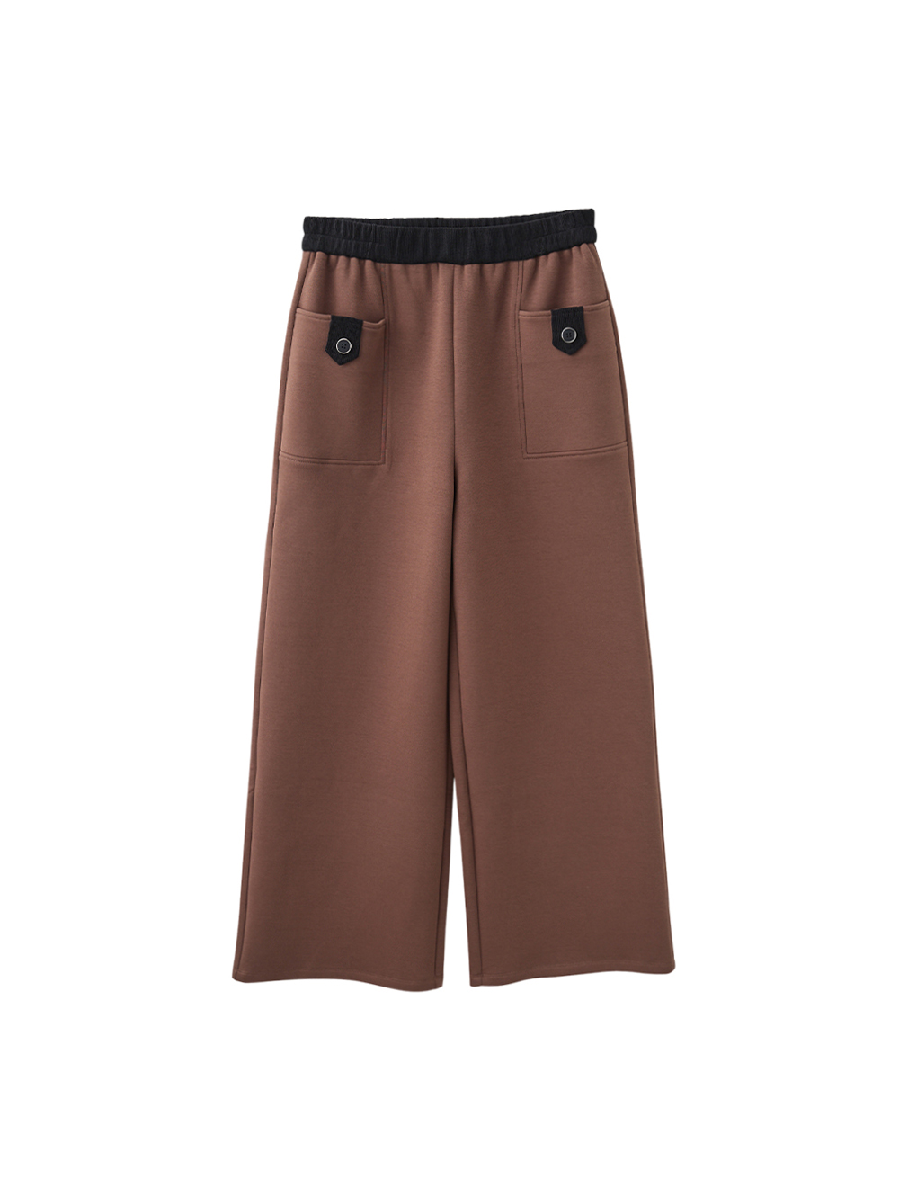 空氣感柔軟面料打造俐落寬褲, 活動機能好親膚舒適。異材質拼接點綴增加細節, 可與同系列上身完成套裝造型。