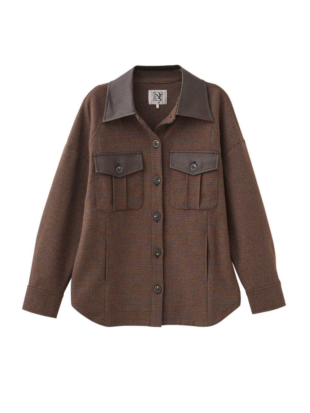 結合溫暖面感格紋布料與仿皮革異材質拼接, 位經典襯衫外套注入率性格調。厚薄適中, 可當襯衫亦可作為外套穿搭。