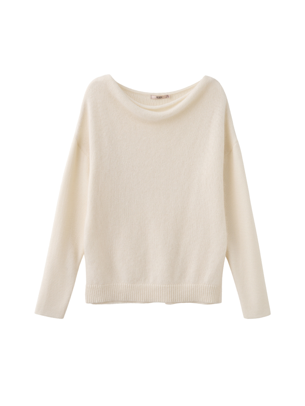 前片採特級蓬鬆浣熊絨, 呈現豐盈毛羽感, 寬領垂墜設計優雅修飾臉型與肩線, 從通勤到周末, 無需思考的百搭質感毛衣